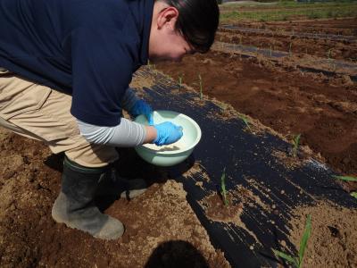 【農業・環境緑地科】4月14日の「野菜」という科目では、とうもろこしの苗を定植し、施肥を行う授業が行われました。